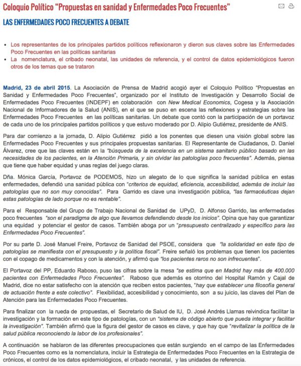 Fecha: 23/04/2015 Las enfermedades poco frecuentes a debate en INDEPF, con la colaboración de Cogesa, New Medical Economics y la Asociación Nacional de Informadores de la Salud.
