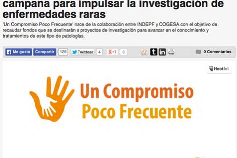 INDEPF y COGESA se unen a favor de las Enfermedades Poco Frecuentes con esta campaña ‘Un Compromiso Poco Frecuente’ con el objetivo de conseguir un alto grado de sensibilización social con este tipo de patologías y recaudar fondos para investigar estas enfermedades.